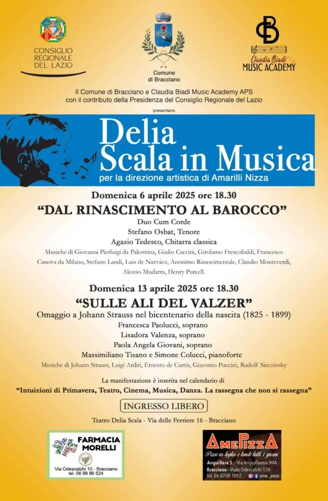 Il Progetto “Delia Scala in Musica” è inserito in “Intuizioni di Primavera, Teatro, Cinema, Musica, Danza La rassegna che non si rassegna” ideata dall’Assessorato alla Cultura del Comune di Bracciano in programma dal 5 aprile al 25 maggio al Teatro del Lago “Delia Scala”.
