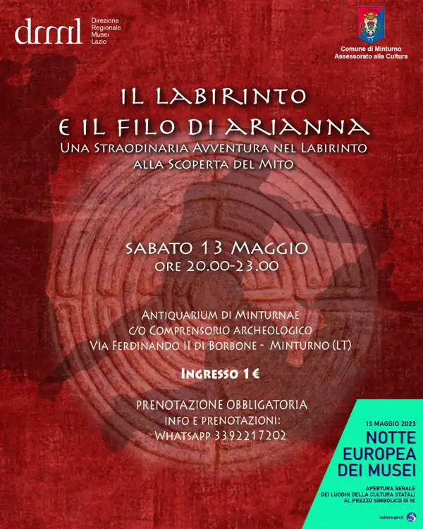 Sabato 13 maggio, a partire dalle ore 20.00, negli ambulacri del teatro romano di Minturnae, si terrà un racconto teatralizzato dal titolo “Il Labirinto e il Filo di Arianna”.