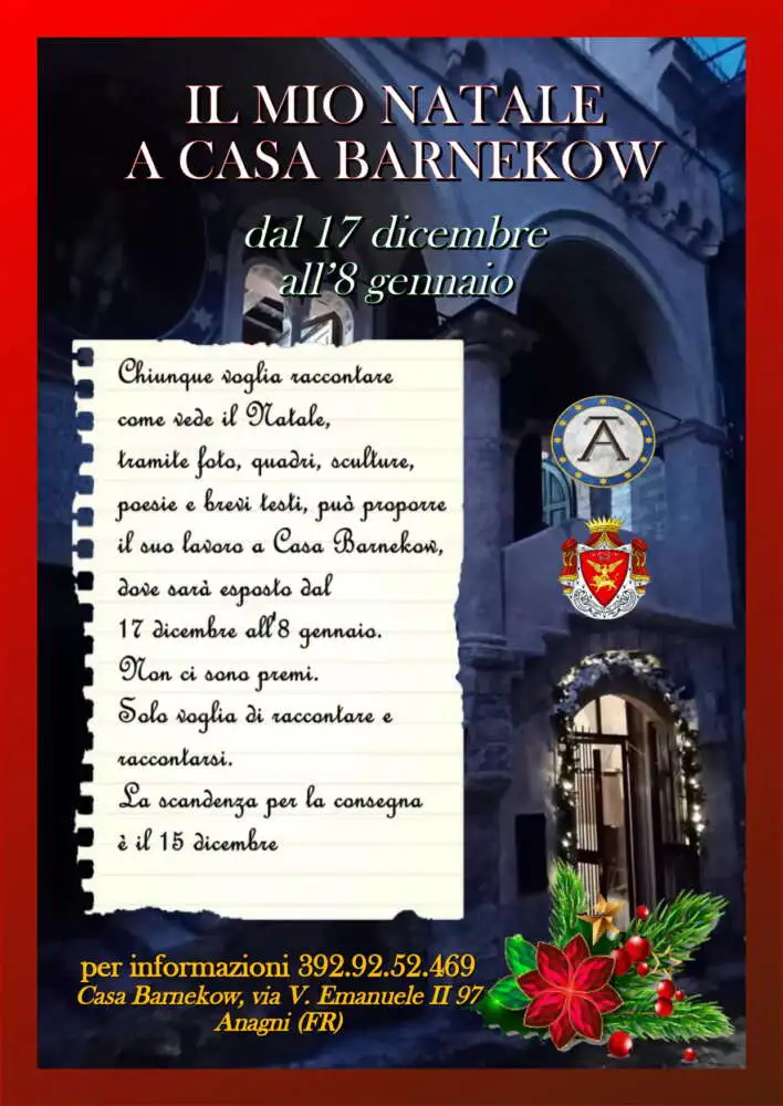 Casa Barnekow inizia i preparativi per un Natale davvero speciale. Quest’anno infatti chiunque voglia potrà esporre una propria opera artistica dedicata alla tematica natalizia all’interno di Casa Barnekow, in una mostra temporanea, visitabile negli orari di apertura della casa, in collaborazione e con il patrocinio del Comune di Anagni, che sarà inaugurata la mattina di sabato 17 dicembre e si concluderà con un finissage domenica 8 gennaio.