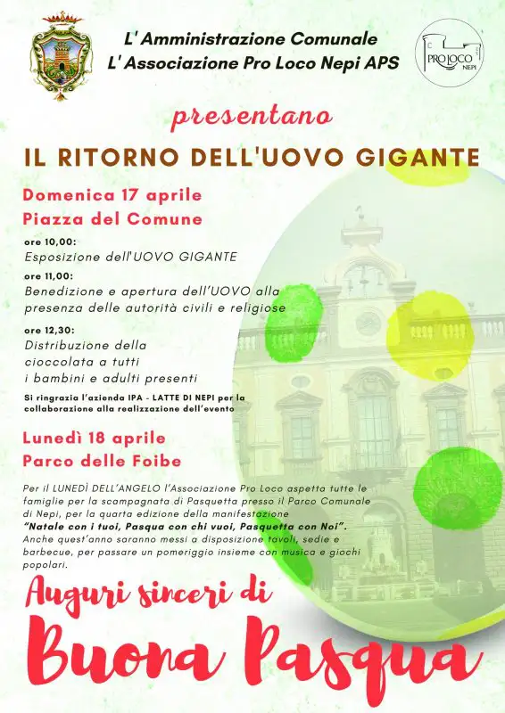 In collaborazione con l’Amministrazione Comunale e grazie alla collaborazione dell’Azienda IPA -Latte di Nepi per la domenica di Pasqua torna l’uovo gigante.