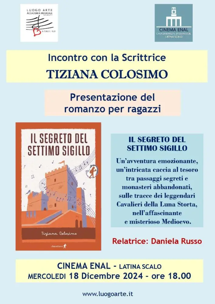 Mercoledì 18 dicembre 2024 alle ore 18.00 presso la Casa di Quartiere Ex Cinema Enal, via della Stazione 170, Latina Scalo (LT) si svolgerà l’incontro con la scrittrice Tiziana Colosimo per la presentazione del libro: IL SEGRETO DEL SETTIMO SIGILLO .