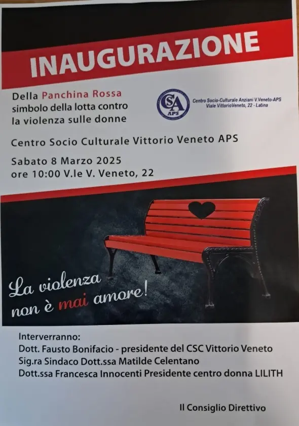 Sabato 8 marzo 2025 il CSA di Latina “V. Veneto” celebra la Giornata Internazionale della Donna con un’iniziativa di grande attualità: l’inaugurazione di una panchina rossa che sarà collocata sotto i portici dell’edificio.