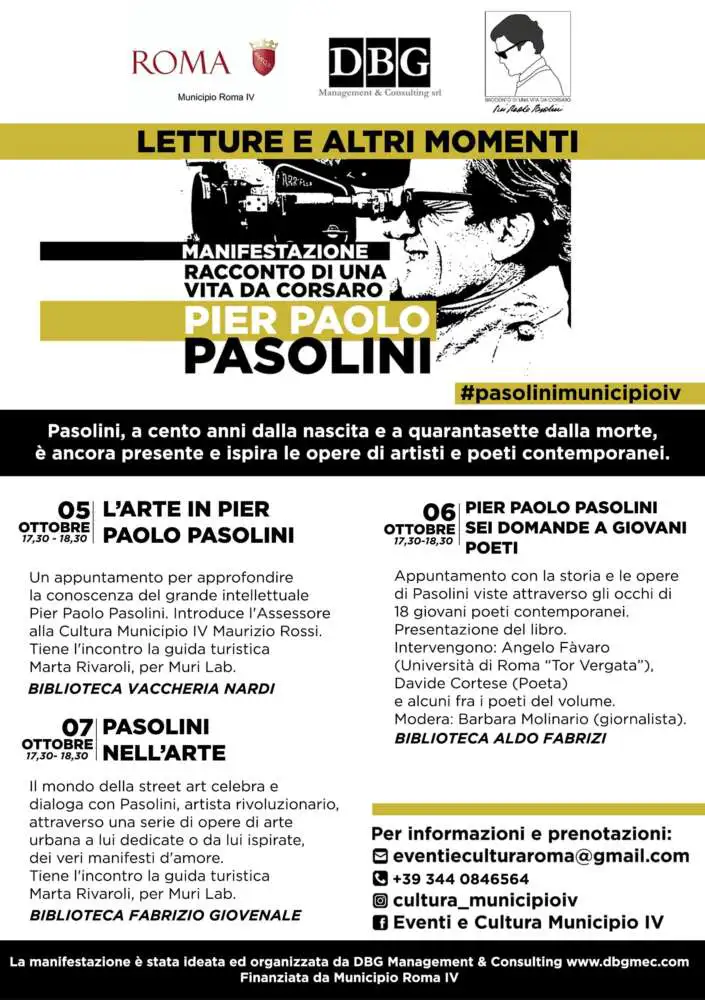 Un ottobre all’insegna della cultura nel IV Municipio di Roma, con gli eventi gratuiti della manifestazione “Racconto di una vita da Corsaro. Pier Paolo Pasolini”, organizzata da DBG Management & Consulting e finanziata dal Municipio IV – Direzione Socio-Educativa.