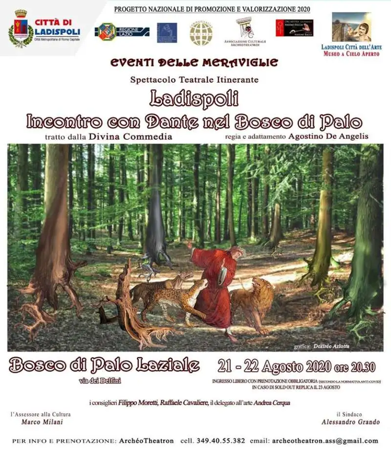 Per la prima volta la piéce debutterà nel magnifico scenario naturale del Bosco di Palo dove l’attore e regista Agostino De Angelis, nella parte di Dante, accompagnato da alcuni attori interpreterà i versi della celebre opera, conducendo lo spettatore in un grandioso viaggio nella Divina Commedia.