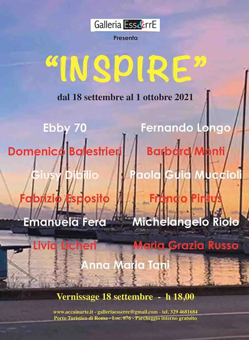Alla Galleria Ess&rrE al Porto turistico di Roma, nella mostra “Inspire” con inaugurazione sabato 18 settembre 2021 alle ore 18:00, in una cornice di primario impatto emotivo a ridosso delle bellissime imbarcazioni a fare da contorno a questa meravigliosa esposizione dal 18 settembre al 1 ottobre 2021, saranno ezoste alcune opere di artisti di assoluto livello pittorico. Gli artisti presenti saranno: Ebby 70, Domenico Balestrieri, Giusy Dibilio, Fabrizio Esposito, Emanuela Fera, Livia Licheri, Fernando Longo, Barbara Monti, Paola Guia Muccioli, Franco Pintus, Michelangelo Riolo, Maria Grazia Russo e Anna Maria Tani.