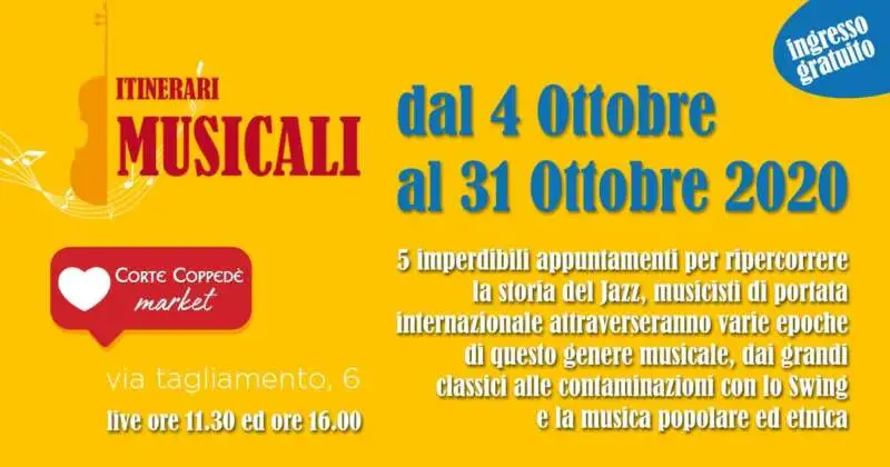 Inizia domenica 4 Ottobre nello spazio eventi del mercatino artigianale corte Coppedé, a Roma in Via Tagliamento 6, ITINERARI MUSICALI, un ciclo di 5 imperdibili appuntamenti, 5 fantastici duetti per ripercorrere la storia del Jazz.