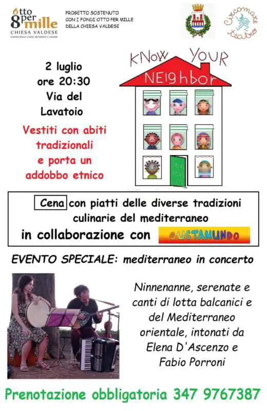Proseguono con successo le cene etniche organizzate dall’associazione Circomare Teatro nell’ambito del progetto di “Know Your Neighbour – conosci il tuo vicino”, sostenuto con i fondi dell’Otto Per Mille della chiesa Valdese avviato già dallo scorso anno.