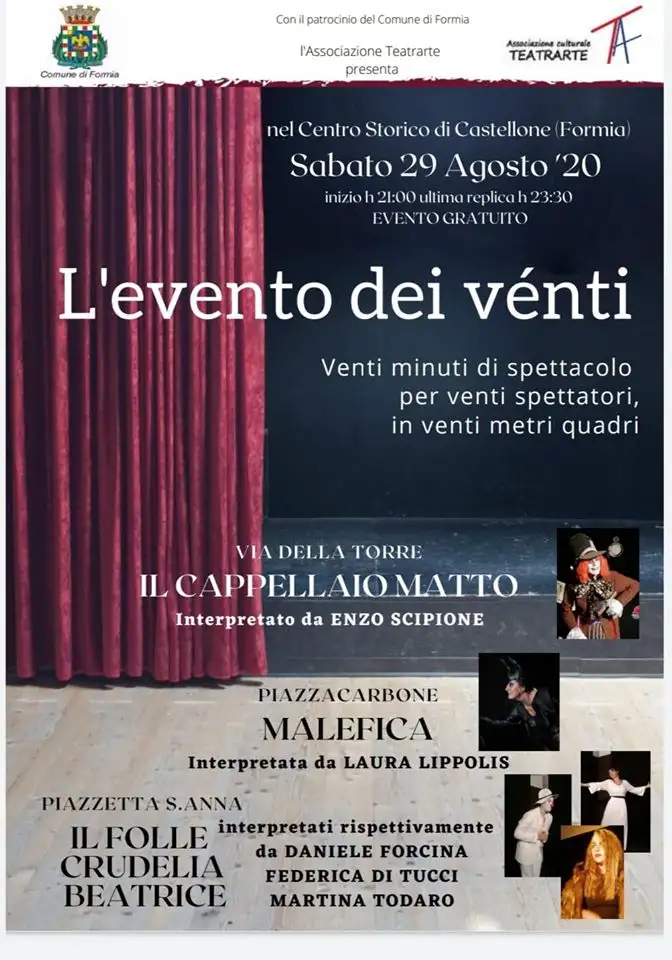 L'associazione Teatrarte vi aspetta per una serata all'insegna della follia e della stravaganza,nel magnifico borgo di Castellone. Un percorso itinerante con 3 corti teatrali della durata di 20 min negli angoli più suggestivi del centro storico...