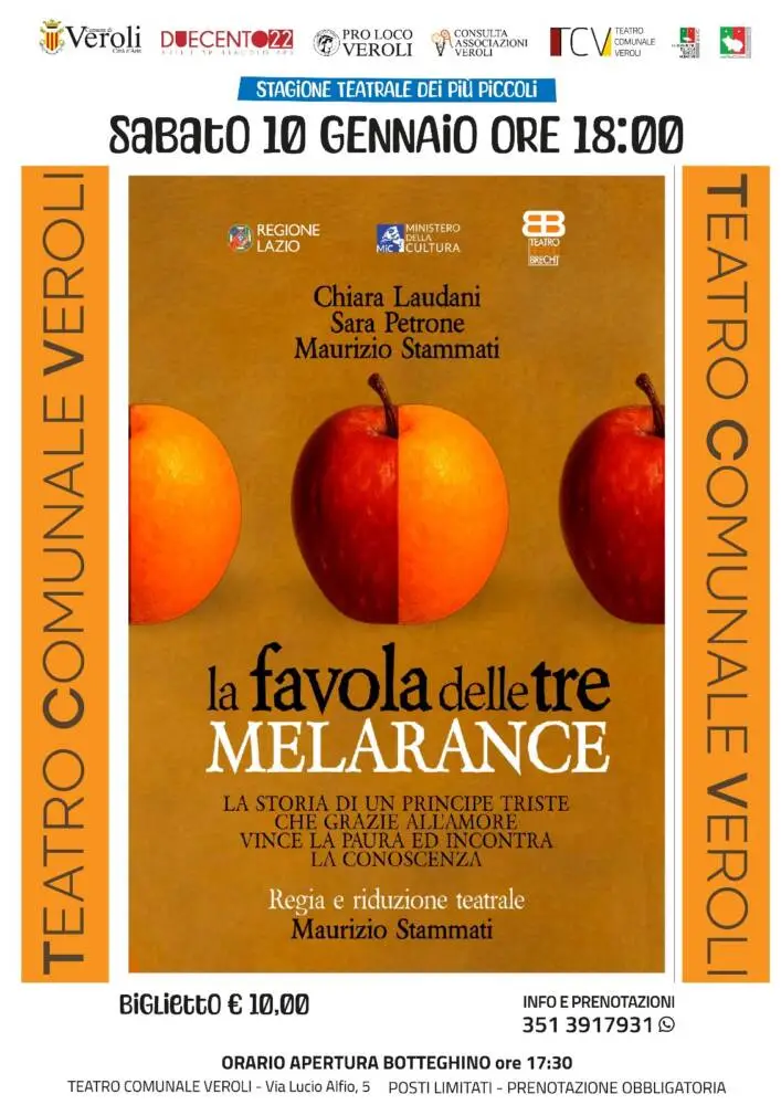 L’epifania ha portato via le feste ma c’è un ultimo regalo per i bambini al Teatro Comunale Veroli: il secondo appuntamento della stagione “Andiamo ragazzi!”, dedicata ai piccoli spettatori ma capace di emozionare anche il pubblico degli adulti. Sabato 10 gennaio in scena “La favola delle tre melarance”: la storia di un principe, di un [...]...