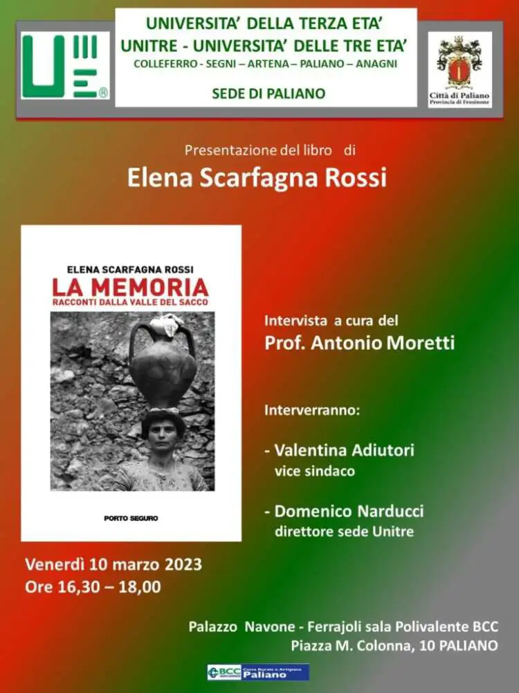 “La Memoria: racconti dalla Valle del Sacco” è il titolo dell’opera a firma di Elena Scarfagna Rossi che verrà presentata il prossimo venerdì 10 marzo alle ore 16.30 nella sala delle conferenze della Banca di Credito Cooperativo di Paliano.