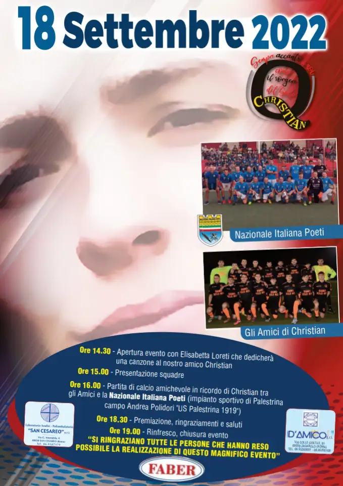 Domenica 18 settembre 2022, dalle ore 14, la Nazionale Italiana Calcio Poeti scenderà in campo all’ ” Andrea Polidori ” di Palestrina per il Memorial Christian Franciosi. Christian è venuto a mancare nel 2019 in seguito ad un incidente occorso sul Grande Raccordo Anulare di Roma. Il suo sorriso e la sua bontà sono rimasti nel cuore di tutti coloro i quali lo conoscevano e i suoi amici e i suoi familiari hanno organizzato un pomeriggio di sport e poesia in suo onore.
