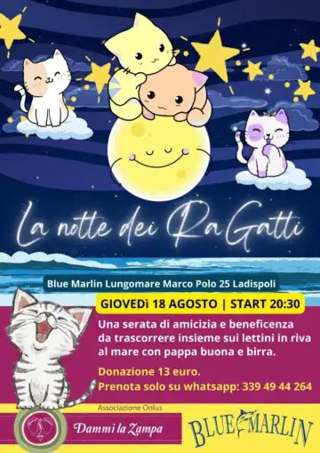 L’evento promosso da Dammi la Zampa in programma giovedì 18 agosto al Blue Marlin di Ladispoli a partire dalle 20.30