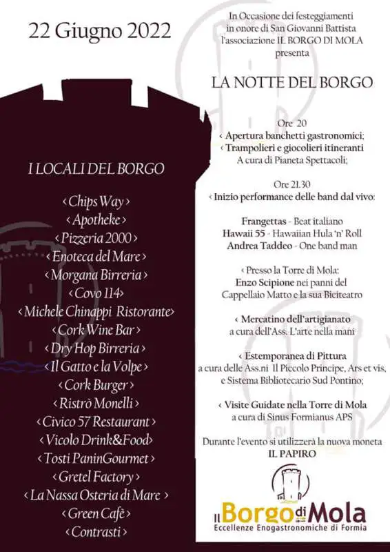 In occasione dei festeggiamenti di San Giovanni, il borgo di mola si accende diventando protagonista per una splendida notte. Tra i vicoli di mola… musica dal vivo, artisti di strada , artigiani …. ed in gustoso percorso gastronomico vi accompagneranno per l’intera serata Una notte organizzata, in occasione delle prossime festività in onore di S.Giovanni [...]...
