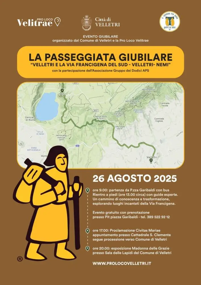 Il Comune di Velletri e la Pro Loco Velitrae organizzano la Passeggiata Giubilare “Velletri e la Via Francigena del Sud – Velletri-Nemi”, con la partecipazione dell’Associazione Gruppo dei Dodici APS. Un evento che unisce natura, spiritualità e tradizione, alla scoperta dei luoghi più suggestivi del territorio.