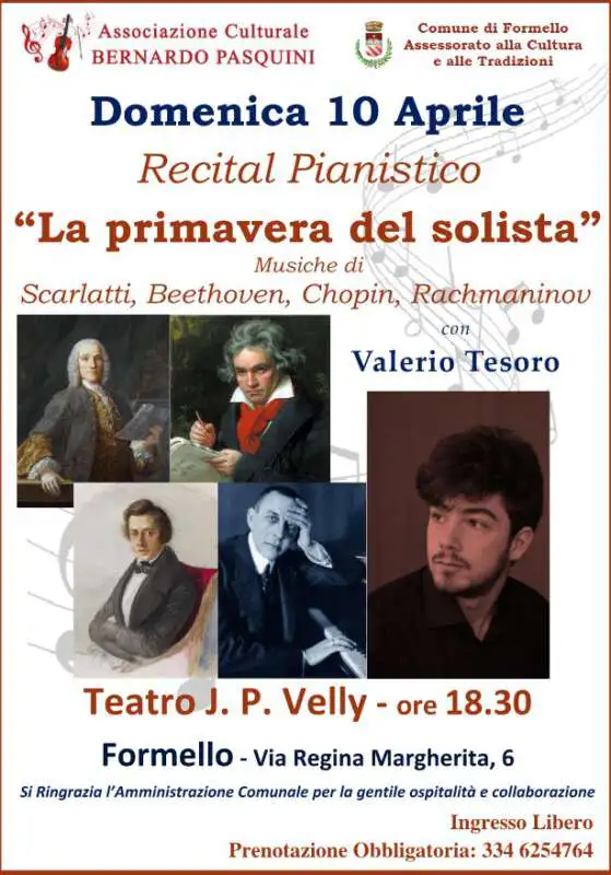 E’ un recital pianistico del M° VALERIO TESORO , titolato “ La Primavera del Pianista “ , che eseguirà musiche dei compositori D. Scarlatti, L.V. Beethoven, F. Chopin, S. Rachmaninov
