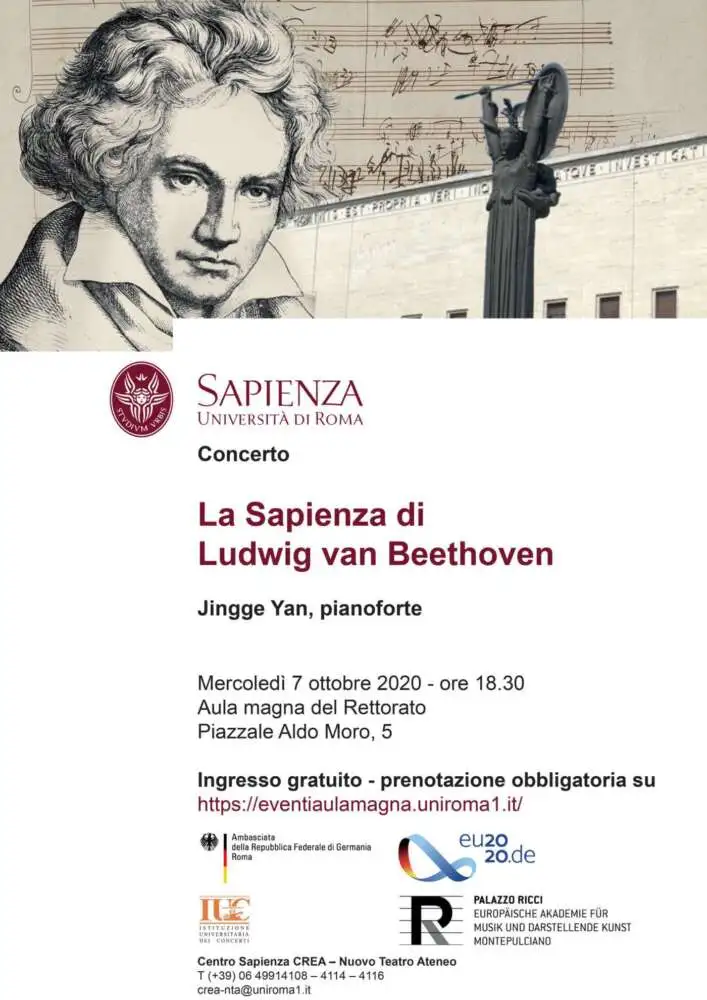 Mercoledì 7 ottobre 2020, alle ore 18.30, avrà luogo il primo concerto della serie La Sapienza di Ludwig van Beethoven. L’evento si inserisce nel quadro delle ricorrenze per il 250° anniversario della nascita del grande musicista (Bonn, 16 dicembre 1770), che si svolgeranno in tutto il mondo per onorare il talento musicale di Beethoven con vari avvenimenti, ma soprattutto con tantissima musica.