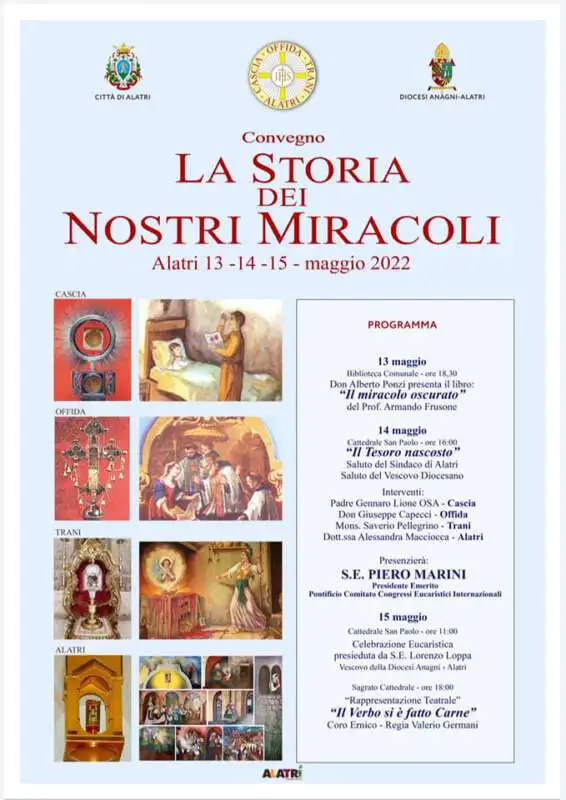 I giorni 13, 14 e 15 maggio si svolgerà ad Alatri, nella Cattedrale San Paolo Apostolo, un evento particolare, dal titolo: “La storia dei nostri miracoli”, legato al miracolo eucaristico dell’Ostia incarnata, la cui teca è custodita proprio nella Cattedrale.