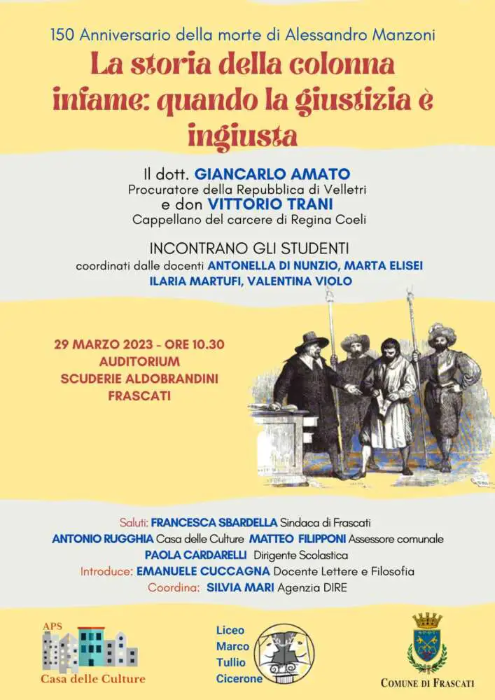 Porteranno il loro saluto la Sindaca di Frascati Francesca Sbardella, il presidente dell’associazione Casa delle Culture Antonio Rugghia, la Dirigente Scolastica Paola Cardarelli, l’assessore Matteo Filipponi. L’intervento introduttivo sull’opera del Manzoni sarà svolto dal prof. Emanuele Cuccagna. Coordinerà l’incontro Silvia Mari dell’agenzia DIRE. Le docenti Antonella Di Nunzio, Marta Elisei, Ilaria Martufi, Valentina Violo, hanno curato la preparazione degli studenti all’evento.