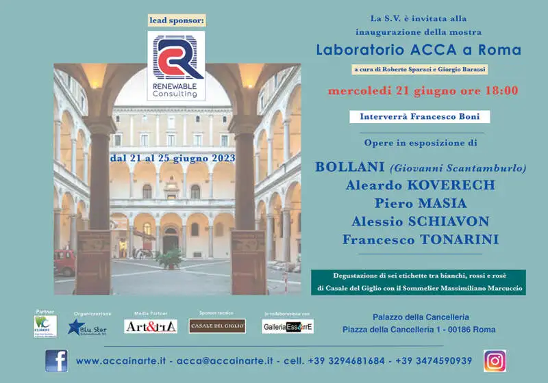 Nelle prestigiose mura del Palazzo della Cancelleria Vaticana a Roma, mercoledì 21 giugno si inaugura la mostra Laboratorio Acca a Roma. Scelti tra gli artisti di Laboratorio Acca, la trasmissione televisiva della domenica sera dalle 21 a mezzanotte, in onda sui canali di Arte Investimenti TV, cinque artisti italiani espongono i loro lavori più significativi.