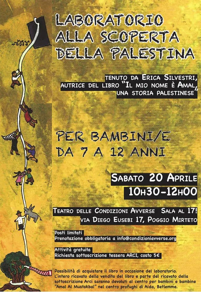 La seconda iniziativa avrà luogo il 20 aprile, dalle 10h30 alle 12h, presso la Sala al 17! del Teatro delle Condizioni Avverse a Poggio Mirteto, con il laboratorio “Alla scoperta della Palestina”, per bambini e bambine da 7 a 12 anni. Il laboratorio sarà tenuto da Erica Silvestri, educatrice ed illustratrice, autrice del libro “Il mio nome è Amal, una storia palestinese”, un viaggio a ritroso nel tempo attraverso il racconto del nonno della bambina Amal. In occasione del laboratorio, durante il quale i partecipanti si cimenteranno in attività artistiche e nella versione gigante del gioco dell’oca “Alla scoperta della Palestina”, sarà possibile acquistare il libro. L’intero ricavato sarà devoluto al centro per bambini e bambine “Amal Al Mustakbal” nel centro profughi di Aida di Betlemme.