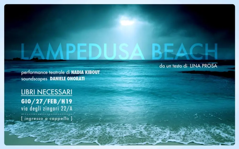 Lampedusa Beach, da un testo di Lina Prosa.Performance teatrale di Nadia Kibout.Soundscapes di Daniele Onorati. “Il mare è innocente, l’uomo invece ha le sue colpe”. La storia di Lampedusa Beach dà vita al teatro del naufragio, compie la sua funzione mitica di ridare corpo a chi non c’è e nome a chi non ce l’ha. [...]...