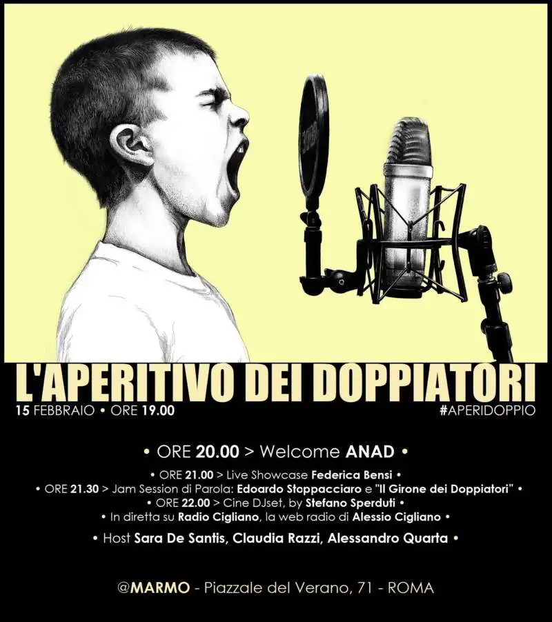 Da mercoledì 15 febbraio alle ore 19.00 presso Marmo a San Lorenzo, ha inizio “L’Aperitivo dei Doppiatori”, il nuovo appuntamento mensile dedicato al mondo del doppiaggio e ai suoi maggiori esponenti, organizzato da ANAD – Associazione Nazionale Attori Doppiatori, l’unica associazione di categoria al servizio dei suoi associati sin dal 1981 e che oggi conta circa 400 iscritti.