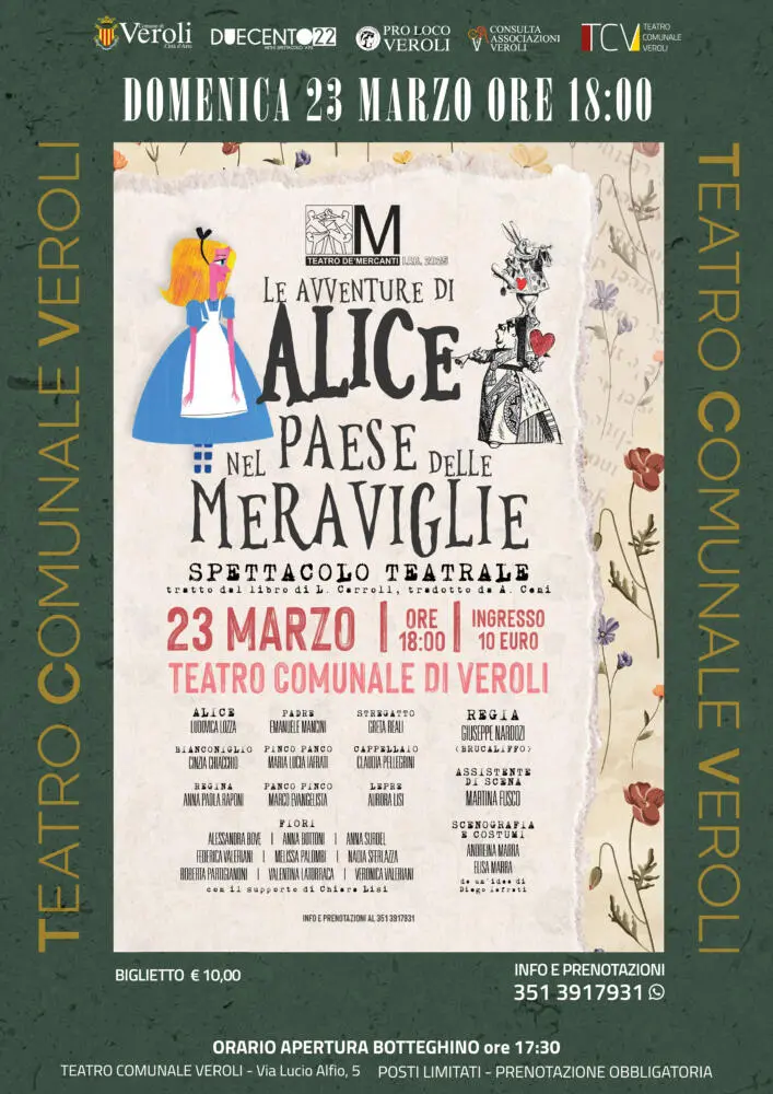 Dopo i numerosi sold-out delle ultime settimane, continua la straordinaria stagione al Teatro Comunale Veroli con “Le avventure di Alice nel paese delle meraviglie”: uno dei più celebri romanzi di Lewis Carrol che continua ad incantare generazioni di bambini e ad affascinare anche gli adulti che possono coglierne il significato più profondo.