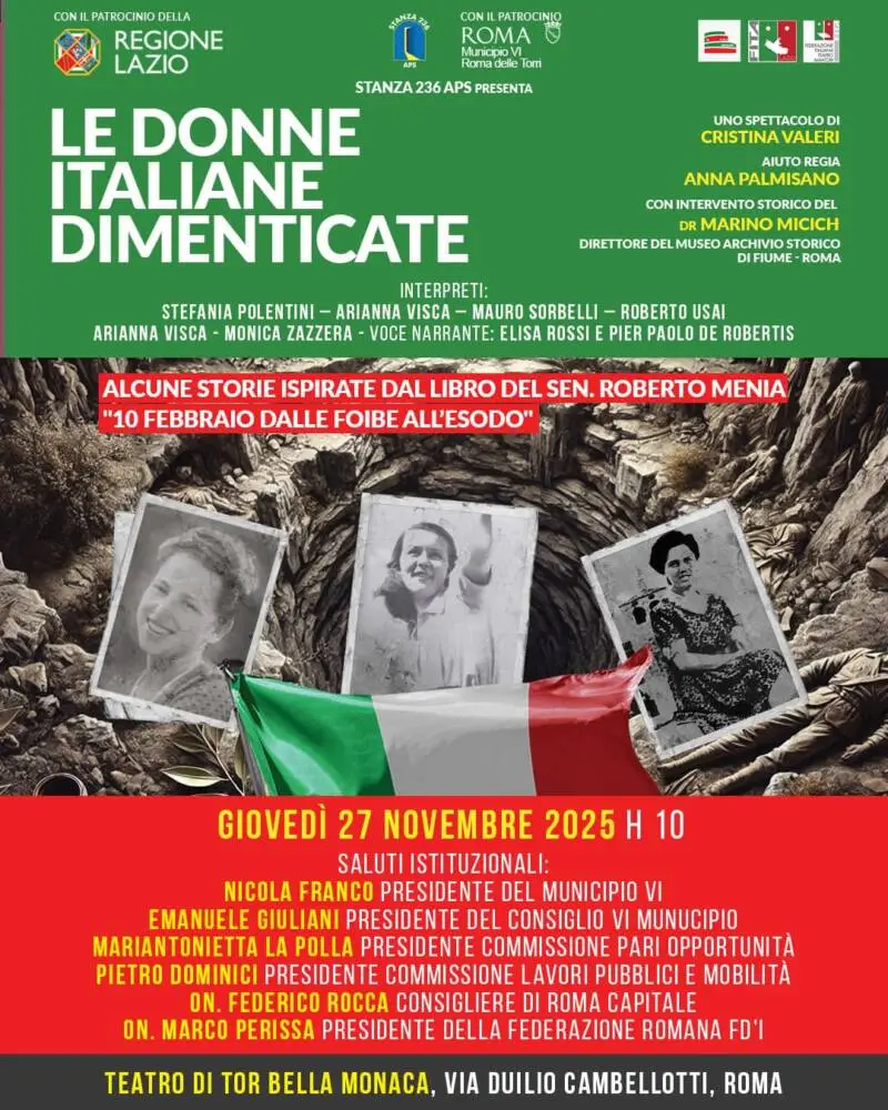 Porteranno i saluti istituzionali l’ON. Marco Perissa ed il Consigliere di Roma Capitale Federico Rocca, mentre interverranno anche il Presidente del VI Municipio Nicola Franco, il Presidente del Consiglio Municipale Emanuele Giuliani, la Presidente della Commissione Municipale Pari Opportunità Mariantonietta La Polla e Pietro Dominici, Presidente della Commissione Municipale Lavori Pubblici e Mobilità. A fornire l’inquadramento storico e scientifico delle vicende narrate sarà il Dott. Marino Micich, Direttore del Museo Archivio Storico di Fiume di Roma. “Il fenomeno della violenza di genere non è figlio solo della modernità – sottolinea Cristina Valeri – per questo ho voluto mettere in scena le storie delle donne dimenticate della storia italiana, grazie al libro del Sen. Menia da cui ho tratto ispirazione.