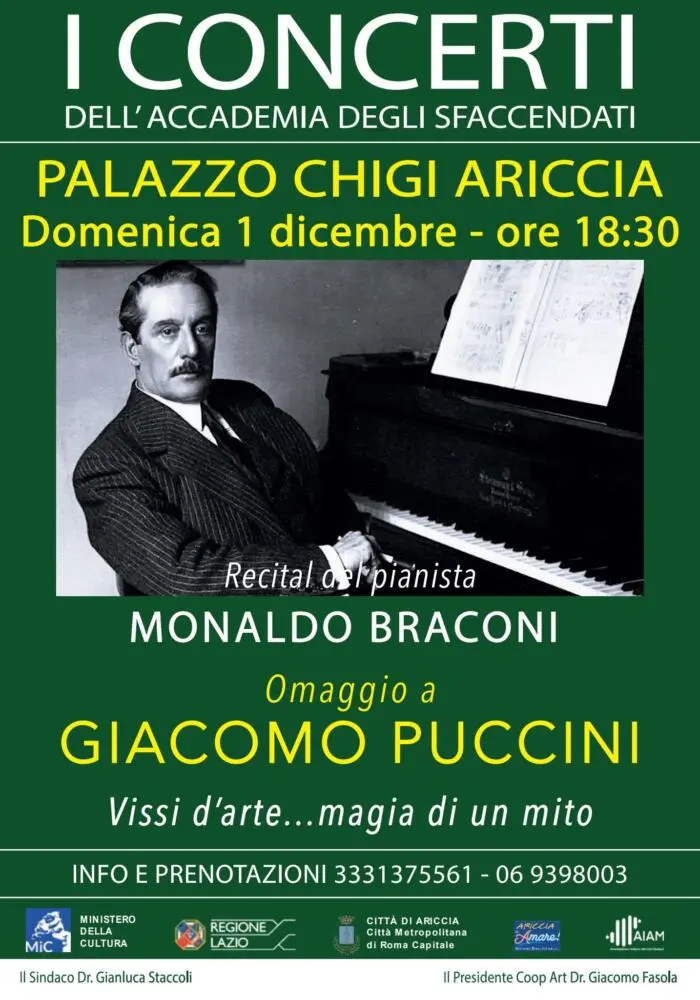 , alle ore 18:30, nella Sala Maestra del Palazzo Chigi di Ariccia, recital del bravissimo pianista Monaldo Braconi chiamato dalla Direzione Artistica de “I Concerti dell’Accademia degli Sfaccendati” per celebrare in modo inusuale l’anniversario di Giacomo Puccini.