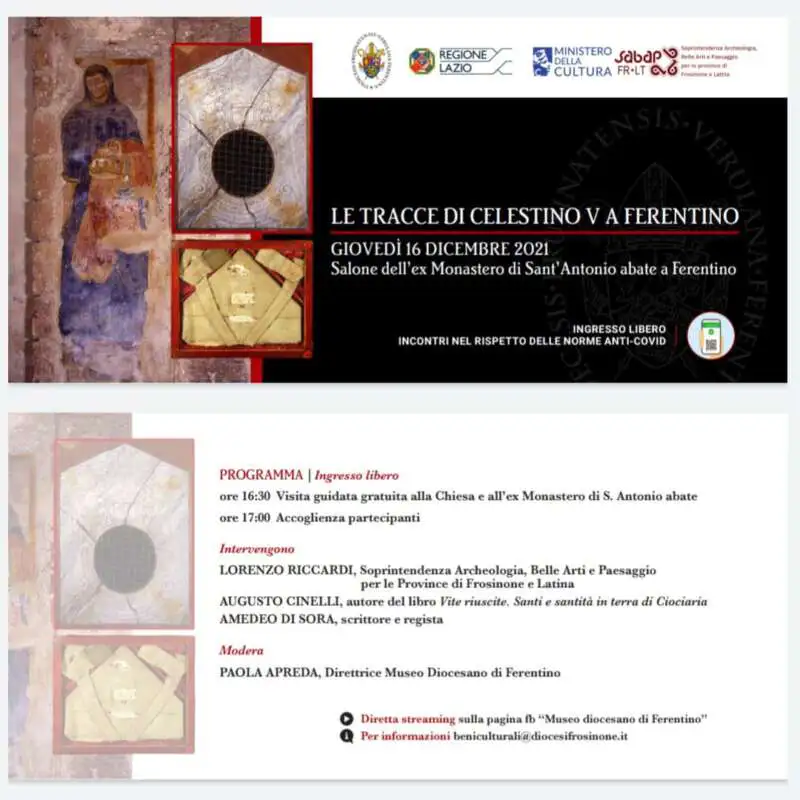 Nel pomeriggio di giovedì 16 dicembre 2021 il salone dell’ex Monastero di Sant’Antonio abate, a Ferentino ospiterà un interessante convegno di studi dal titolo “Le tracce di Celestino V a Ferentino”.