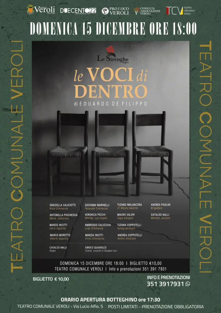 Ambiguità tra sogno e realtà e incomunicabilità: queste sono due tematiche affrontate da un grande classico del teatro, “Le voci di dentro” di Eduardo de Filippo, la cui riproposizione andrà in scena al Teatro Comunale Veroli con la compagnia Le Strenghe APS, guidata dalla regia di Cataldo Nalli.