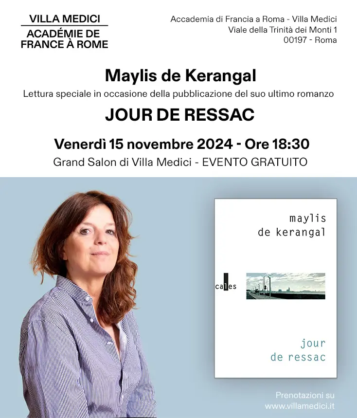 Venerdì 15 novembre alle ore 18:30, presso il Grand Salon di Villa Medici, la scrittrice francese Maylis de Kerangal terrà una lettura speciale in occasione della pubblicazione del suo ultimo romanzo, Jour de ressac, edito da Éditions Verticales. L’evento sarà un’opportunità unica per immergersi nell’universo narrativo dell’autrice, con brani che evocano con intensità e profondità tematiche di perdita, memoria e trasformazione.