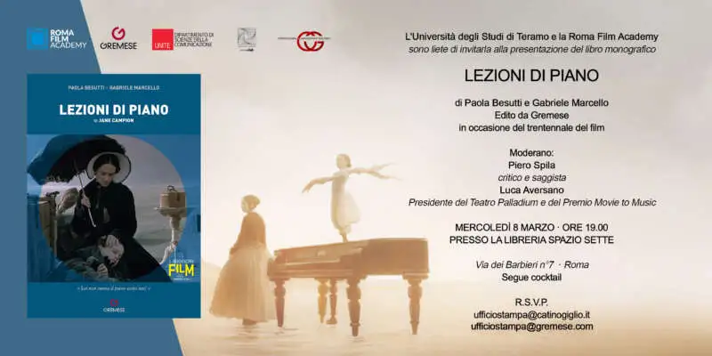 Avrà luogo giovedì 8 marzo alle ore 19:00 presso la Libreria Spazio Sette di Roma la presentazione ufficiale del volume che, a trent’anni di distanza dalla sua prima uscita cinematografica, rende omaggio ad un’opera cult che ha segnato una svolta nella cinematografia femminile: Lezioni di piano di Jane Campion. Scritta a quattro mani da Paola Besutti e Gabriele Marcello, questa prima monografia sul film è appena uscita per Gremese Editore all’interno della collana “I Migliori film della nostra vita”. Insieme agli autori ne discuteranno il critico e saggista cinematografico Piero Spila e il presidente del Teatro Palladium e del Premio Movie to Music Luca Aversano. Un giorno speciale per celebrare un’artista – prima donna della storia del cinema a vincere la Palma d’Oro a Cannes – che si è dimostrata un’innovatrice nel linguaggio e narrazione di genere, trasformando – proprio con Lezioni di Piano – l’idea di cinema al femminile e di adattamento letterario.