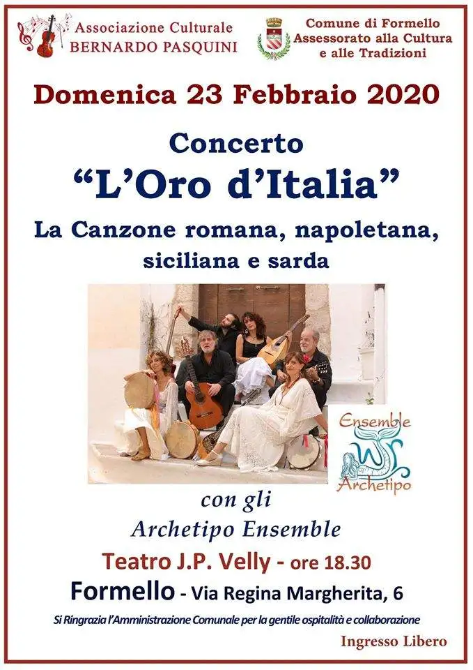 L’associazione culturale “Bernardo Pasquini” promuove, domenica 23 febbraio alle 18,30, il concerto dal titolo “L’oro di Italia” nel teatro comunale “Velly”, con protagonista il gruppo Archetipo Ensemble.