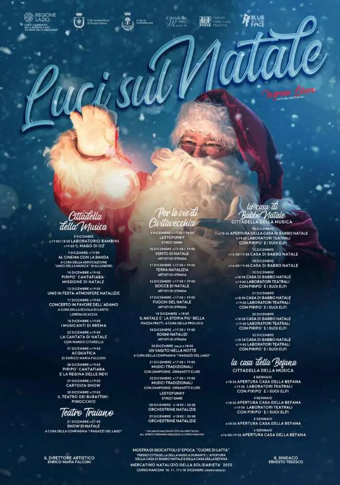 Laboratori, spettacoli teatrali, concerti, teatro dei burattini (alla Cittadella della Musica, dall’8 al 30 dicembre); lo Show di Natale (al Teatro Traiano, la sera del 21); esibizioni di street band, artisti di strada e orchestrine per le vie e piazze della città (dal 9 al 29) inoltre al suono di zampogne, organetti e lire.