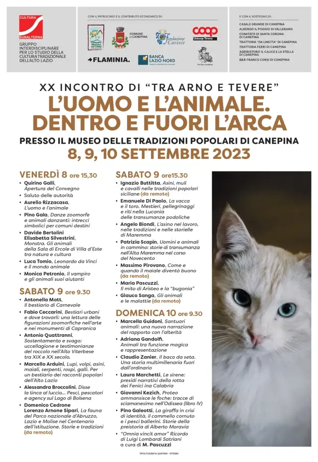 Il Gruppo interdisciplinare per lo studio della cultura tradizionale dell’Alto Lazio promuove il ventesimo appuntamento del ciclo di incontri “Tra Arno e Tevere” dal titolo “L’uomo e l’animale. Dentro e fuori l’Arca“, in programma venerdì 8, sabato 9 e domenica 10 settembre 2023 presso il Museo delle Tradizioni Popolari di Canepina (VT). Tema del convegno gli animali che hanno condiviso le sorti del genere umano e quelli che vivono la loro libertà.