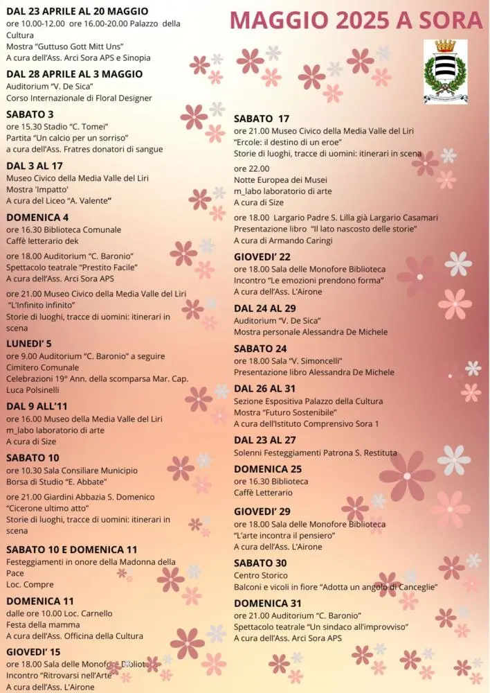 Un ricco calendario di eventi che ci accompagneranno per tutto il mese di maggio 2025! In attesa della programmazione estiva, la città di Sora offre a cittadini e turisti appuntamenti all’insegna della cultura, della tradizione, dell’arte, del divertimento e di tanto altro… Vi aspettiamo a Sora!...