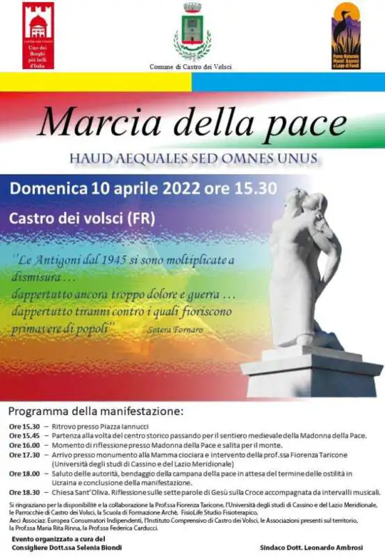 Castro dei Volsci – uno dei borghi più caratteristici della provincia di Frosinone che sorge laddove un tempo vi era il confine tra lo Stato Pontificio e il Regno di Napoli – indossa i colori della Pace e scende in piazza per dire “no” alla guerra, anacronismo distruttivo che contraddice ogni concezione di progresso e umanità: domenica prossima 10 aprile – organizzata dalla dott.ssa Selenia Biondi, consigliere comunale, e dal sindaco dott. Leonardo Ambrosi – si terrà la marcia della Pace.