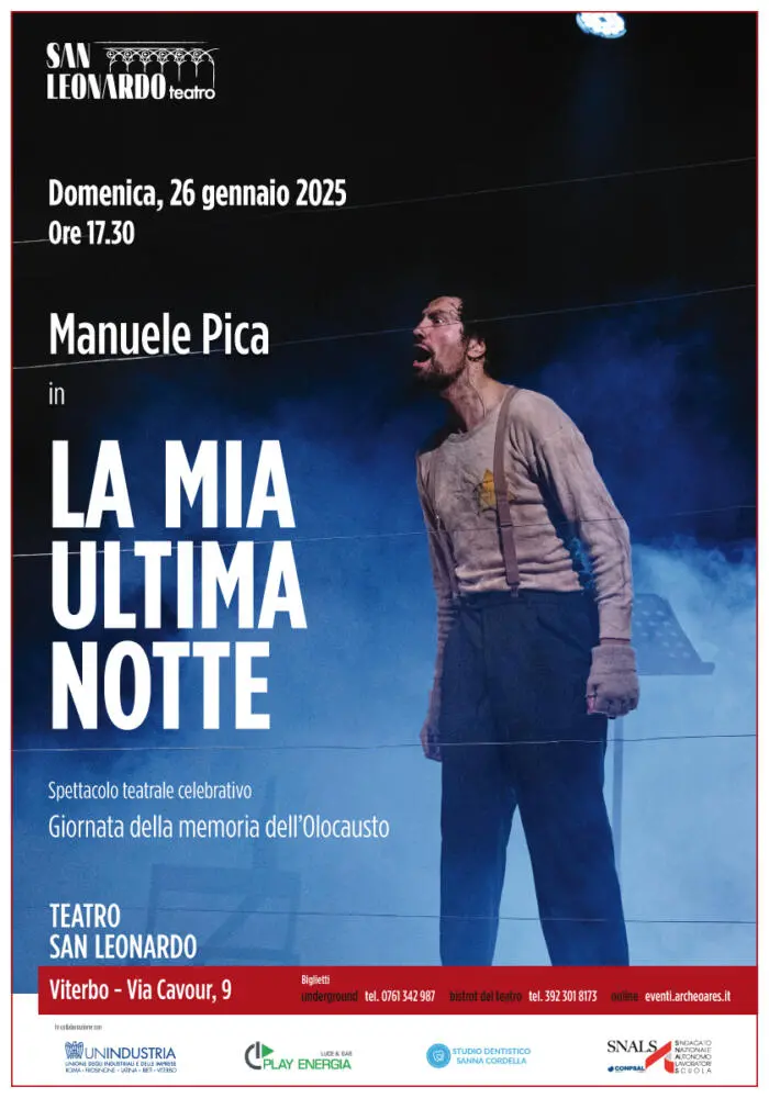 In occasione della Giornata della Memoria, Manuele Pica porta in scena lo spettacolo “La mia ultima notte”, un monologo tratto dal capolavoro di Eliezer Wiesel, “La Notte”. L’evento, patrocinato e realizzato con la collaborazione del Comune di Viterbo, Unindustria, Studio dentistico Sanna Corbella, Play Energia e Snals, rappresenta un momento di intensa riflessione interiore e collettiva, nonché un tributo solenne alla memoria delle vittime dell’Olocausto.