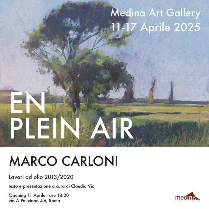 Dall’11 al 17 Aprile 2025 Medina Art Gallery presenta la mostra personale di Marco Carloni “EN PLEIN AIR”.Testo curatoriale e presentazione a cura di Claudia Via, presso la galleria di Via Angelo Poliziano, 4-6, Roma.