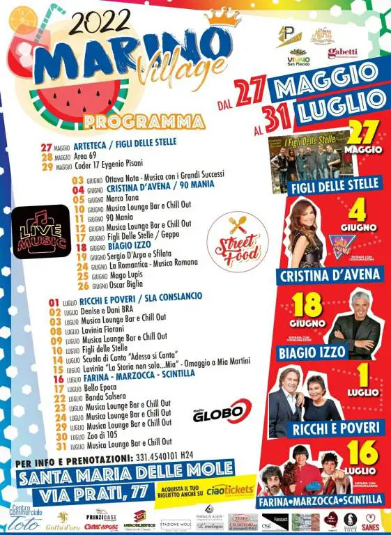 Già organizzatore negli ultimi anni di numerosi eventi, come la Notte Bianca, la Festa di Primavera e il Villaggio di Babbo Natale, il fotografo e organizzatore di eventi Andrea Paciotti ha preparato un grande appuntamento per la frazione marinese di Santa Maria delle Mole: il Marino Village, in programma dal 27 maggio al 31 luglio e organizzato dalla società A.P. Foto Srls.