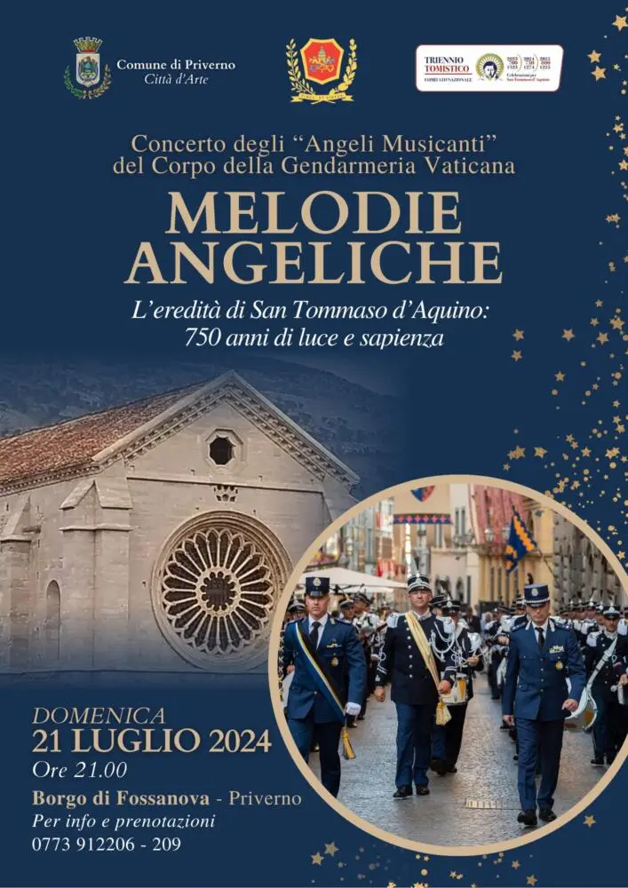 Nell’ambito delle celebrazioni per il 750° anniversario della morte di San Tommaso d’Aquino, domenica 21 luglio, alle ore 21,00, nella prestigiosa cornice del Borgo di Fossanova, risuoneranno le note della Banda Musicale del Corpo della Gendarmeria Vaticana, diretta dal Maestro Stefano Iannilli, con la partecipazione straordinaria della soprano Anna Kazlova e del tenore Vasco Maria Vagnoli.