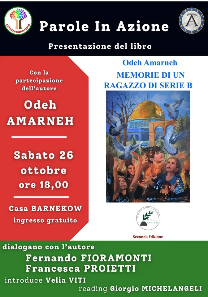 All’incontro sarà presente l’autore Odeh Amarneh, avvocato e poeta palestinese, che nel libro, espone, in modo chiaro e avvincente, episodi della sua vita di adolescente, quando subì un processo e una condanna a mesi di carcere estremamente duro e a trattamenti, al limite del disumano, da parte dei carcerieri israeliani.