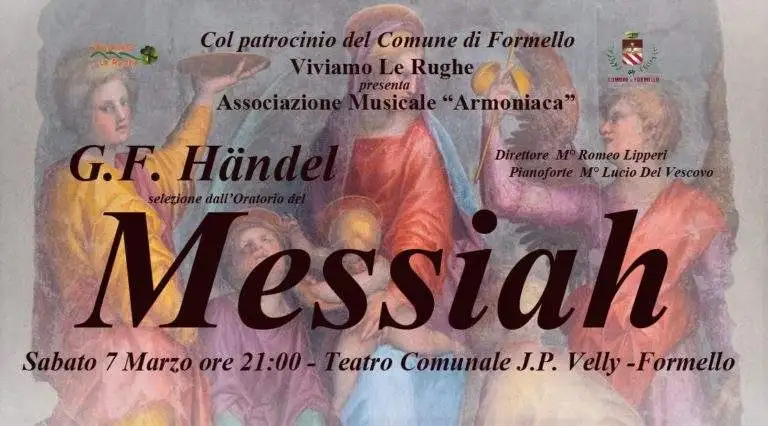L’associazione “ViviAmo le Rughe” promuove, sabato 7 marzo alle 21, al teatro “J.P. Velly” di Formello, il concerto di musica sacra dedicato al “Messiah” di Handel, iniziativa patrocinata dal Comune a cura di Giancarlo Fois, con il coro diretto dal maestro Romeo Lipperi e al pianoforte il maestro Lucio Del Vescovo.
