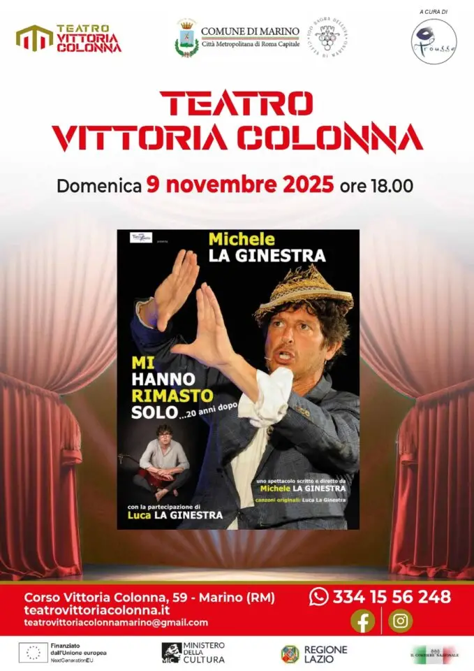 Domenica 9 novembre 2025 alle ore 18,00 andrà in scena al Teatro Vittoria Colonna di Marino lo spettacolo scritto e diretto da Michele La Ginestra dal titolo “Mi hanno rimasto solo … 20 anni dopo”” con la partecipazione di Luca La Ginestra, autore delle canzoni originali.