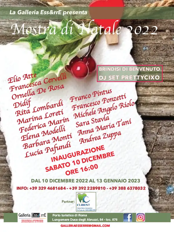 Nuovo appuntamento in vista del Natale alla Galleria Ess&rrE di Roberto Sparaci, che nella programmazione autunno/inverno al Porto Turistico di Roma, presenta una selezione di opere dall’elevato interesse pittorico. Diverse espressioni artistiche dove la mostra, curata da Alessandra Antonelli, annuncia di fatto una stagione tra le più interessanti con talenti della nostra pittura e scultura. Opere che con la loro particolare attenzione ai gusti dei collezionisti più raffinati che da molti anni trovano consensi nelle varie generazioni artistiche che si affacciano nel nostro panorama espositivo. Le mostre assemblate con particolare cura da Fabrizio Sparaci, sono vissute con estrema attenzione e notevoli apprezzamenti. In questo particolare momento, la Galleria Ess&rrE, avendo cura di ogni minimo dettaglio, vi invita per sabato 10 dicembre alla presenza di molti artisti e le telecamente di ZTL TV pwer un brindisi di benvenuto e per augurare a tutti i presenti un meravigioso Natale euno strepitoso 2023. La mostra sarà visitabile fino al 13 gennaio 2023, sarà interamente ripresa dalle telecamere di ZTL TV, pubblicizzata nel nuovo numero di Art&trA di Acca International e musicalmente accompagnata da DJ SET PRETTYCIXO.