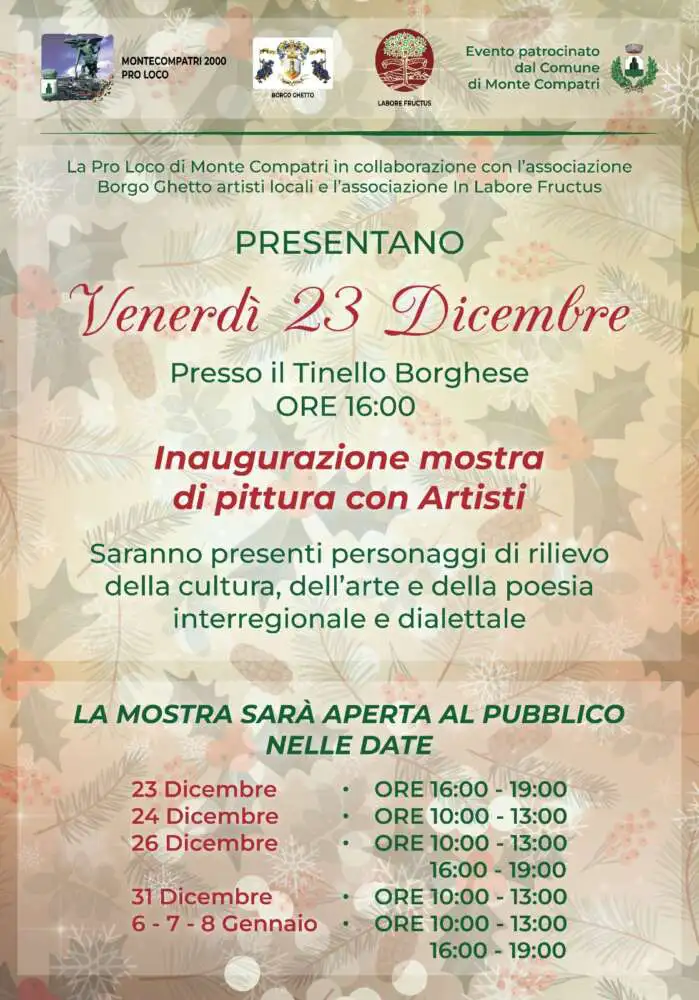 Venerdì 23 dicembre, dalle ore 16:00 al Tinello Borghese ci sarà l’inaugurazione della mostra pittorica degli artisti del territorio, all’occasione parteciperanno anche i poeti dialettali, per recitare le loro opere.