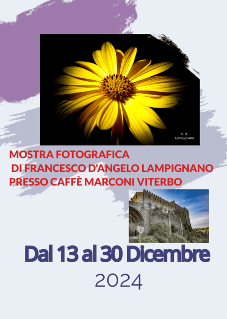 IL Caffè Marconi di Viterbo ospiterà una mostra fotografica del fotografo Francesco D’Angelo Lampignano. L’esposizione, intitolata “Viterbo: Tra Storia e Natura”, offrirà ai visitatori un viaggio visivo attraverso i palazzi storici della città, la natura incontaminata della provincia di Viterbo, il mare e i pittoreschi borghi della regione.Le fotografie di D’Angelo Lampignano catturano l’essenza e la bellezza di Viterbo, mettendo in risalto sia l’architettura storica che i paesaggi naturali che circondano la città. Ogni scatto è un’opera d’arte che racconta una storia, invitando gli spettatori a esplorare e apprezzare le meraviglie di questa affascinante regione. Tra le opere esposte, i visitatori potranno ammirare immagini suggestive del mare della provincia di Viterbo e dei suoi incantevoli borghi.Il Caffè Marconi, noto per il suo ambiente accogliente e raffinato, sarà la cornice perfetta per questa mostra. Gli amanti della fotografia e della cultura avranno l’opportunità di immergersi in un’esperienza unica, ammirando le opere di un fotografo che ha saputo cogliere con maestria l’anima di Viterbo.Non perdete l’occasione di visitare questa imperdibile esposizione, che sarà aperta al pubblico tutti i giorni dal 13 al 30 dicembre. L’ingresso è gratuito