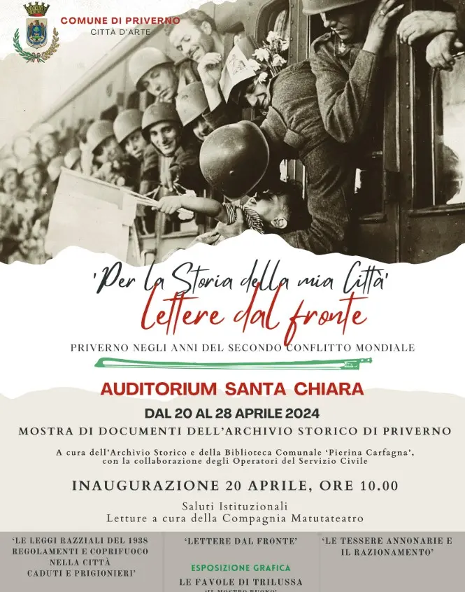 Nell’ambito delle progettualità volte alla promozione della crescita sociale e storico culturale del territorio e, in occasione dell’anniversario della Liberazione dell’Italia dal nazifascismo, l’Amministrazione Comunale, in collaborazione con l’Archivio Storico, la Biblioteca Comunale “Pierina Carfagna”, e gli operatori del Servizio Civile, organizza la Mostra “Per la storia della mia Città, Lettere dal fronte”, dedicata alle memorie di Priverno negli anni del secondo conflitto mondiale.