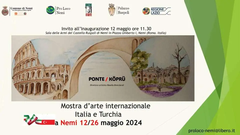 Dal 12 maggio al 26 maggio il Castello Ruspoli sarà il palcoscenico di un’esperienza artistica unica, con la mostra “PONTE / KÖPRÜ”. Questo straordinario evento di arte contemporanea, organizzato dall’associazione Pro Loco Nemi in collaborazione con Archi D’Arte Odv, celebra le connessioni culturali tra l’Italia e il resto del mondo, con un focus speciale sull’Italia e la Turchia.